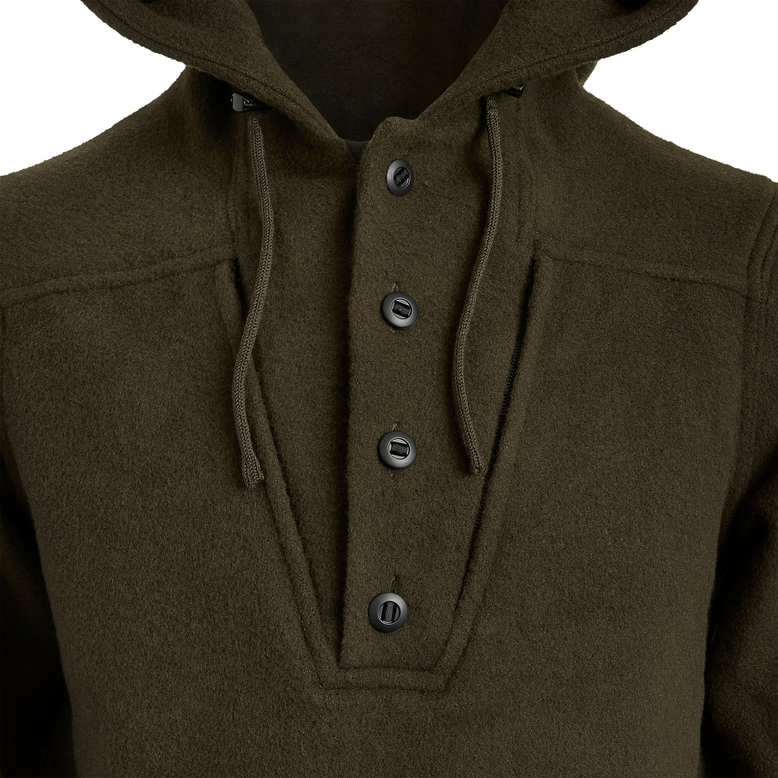 The sides and front opening of the Hood of the WeatherWool Anorak are adjusted by means of laces and cord locks.  The laces are made of the same 100% WeatherWool Certified Fine Wool Fiber as the rest of the garment.   A separate adjustment from the read of the Hood control how far forward or back the Hood sits on the head.